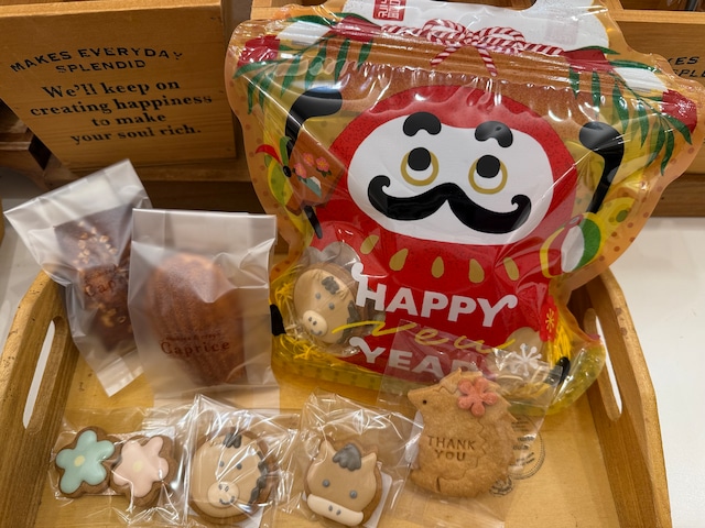 写真のアイシングクッキーと焼き菓子が入ったお正月のプチギフトです。 賞味期限は アイシングクッキー1/13 です。