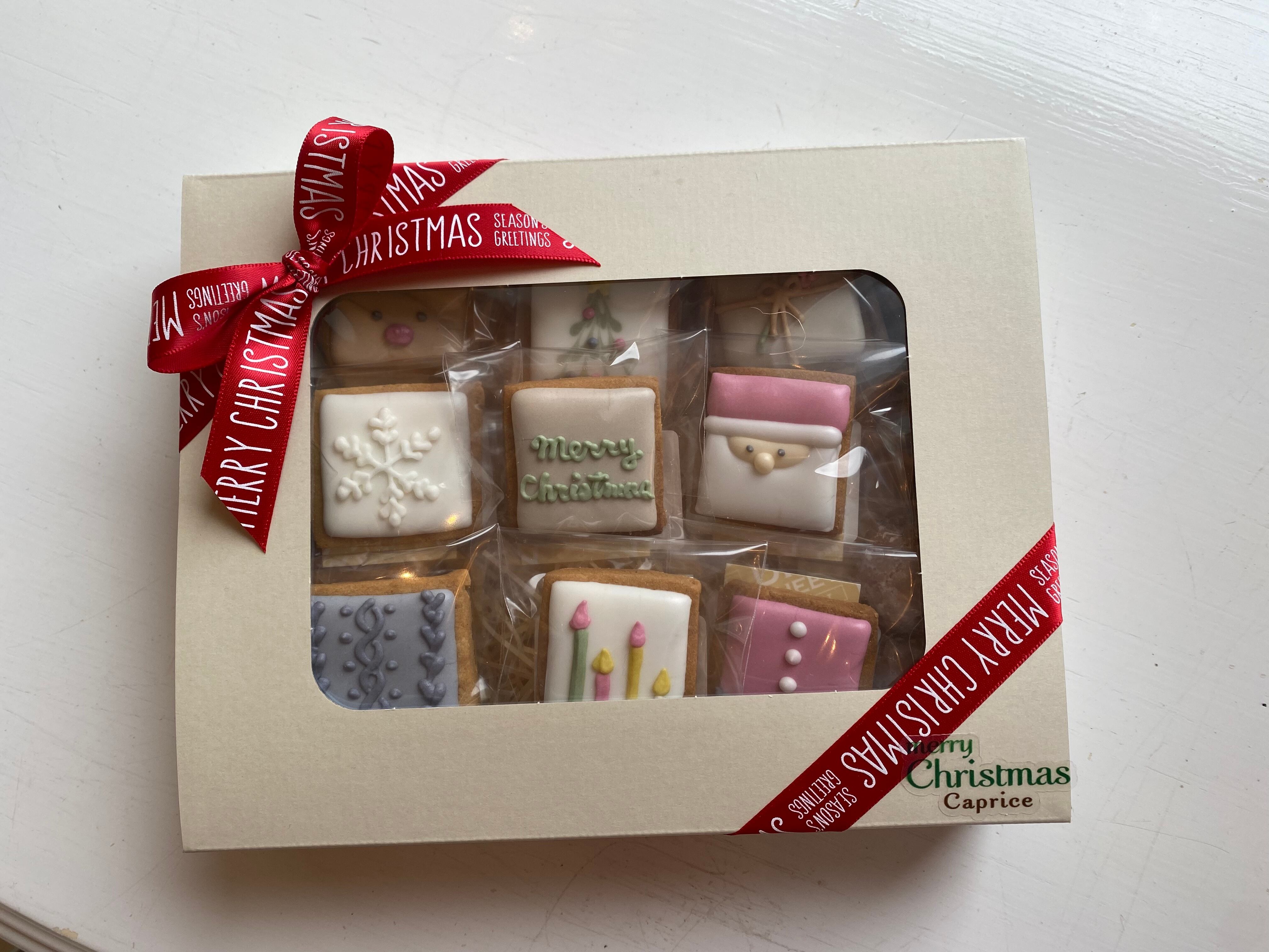 正方形のミニクッキーにクリスマスモチーフが描かれたアイシングクッキーが9枚。