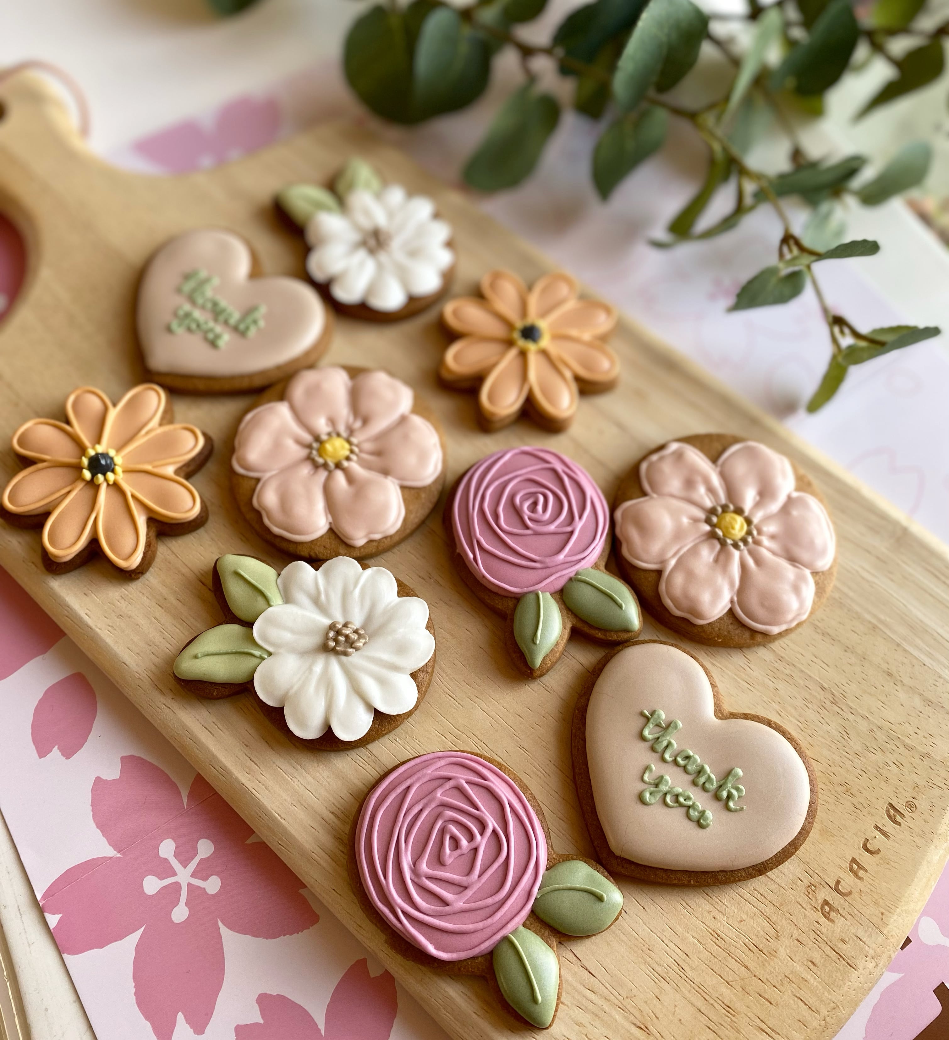 ハートのthank youと4種類のお花のアイシングクッキーです。