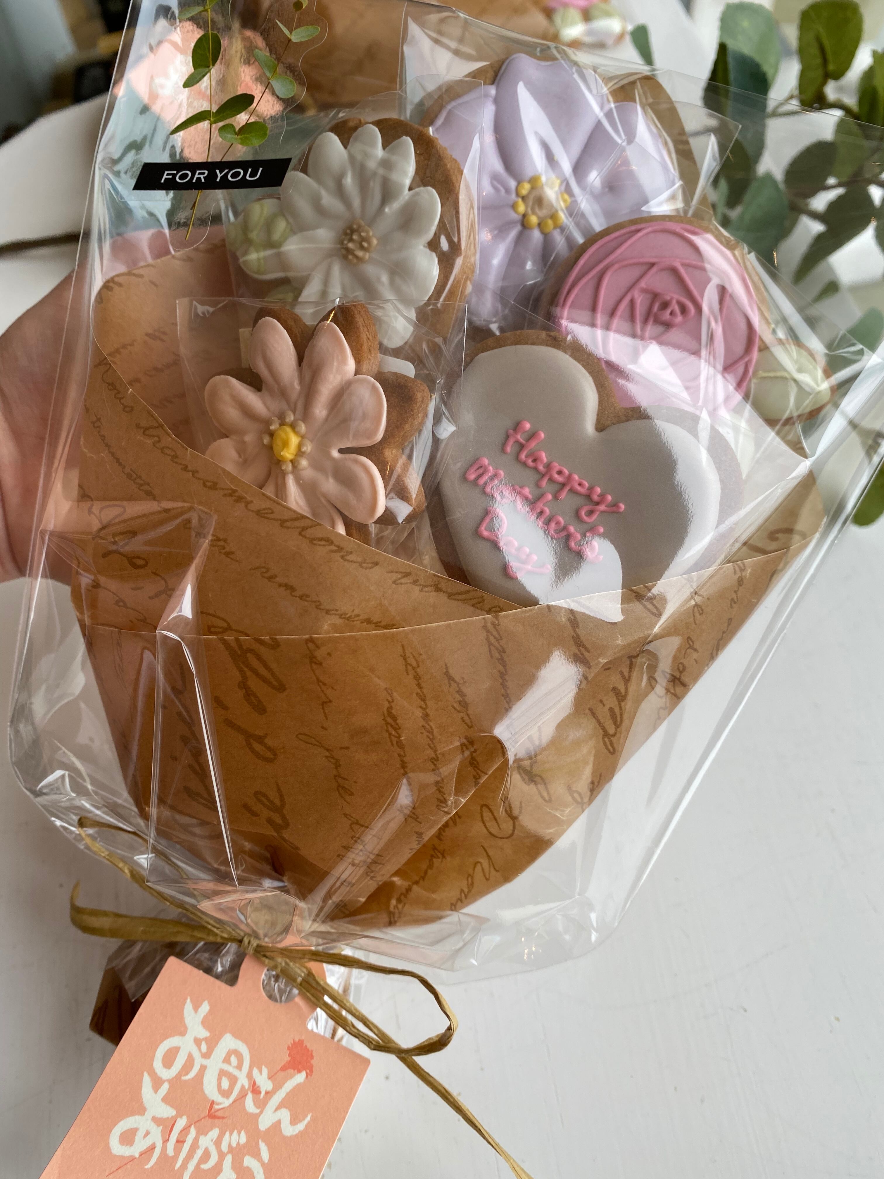 お花とハートのアイシングクッキーで作ったブーケのギフトです。