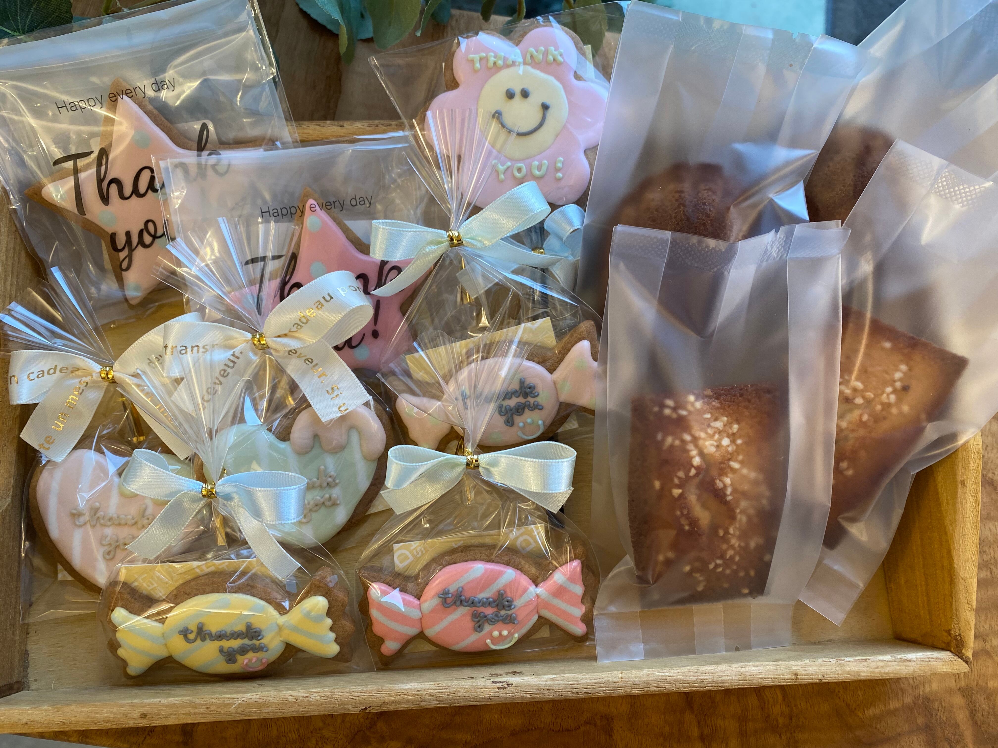 写真のthank youのアイシングクッキー8点とマドレーヌ2点、フィナンシェ2点の詰め合わせです。